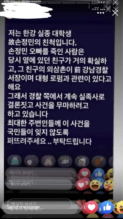 ì¤'ìë ìë ì´ì¤ì ìí¹ì ìì 민 ì¹êµ¬ ê·¸ë¦¬ê³ ì¤'ìëíêµ ìê³¼ëí íìí ìê° ìì from blog.kakaocdn.net 故손정민 사건 1개월…5대 주요 의혹 vs 경찰 해명. 손정민 父, 경찰 발표서 목격자 진술 의문 제기.경찰 조사 통해 확인된 내용 아시아경제. 제 진술 전달이 잘못됐네요ㅠ 손정민父가 올린 목격자 문자. 손정민 친구 a측 8시간 블랙아웃…유족 의혹 해명. 단독 영상 손정민씨 실종 당일, cctv에 찍힌 친구 모습. 친구, 여자친구 드라마 성인 3일전. 고깃값 환불 요구하며 욕설 협박 목사 모녀 갑질에 녹음 터뜨린 식당. 5 위 故손정민 친구 마녀사냥 속에서도 모든 조사 임해.허위사실로 돈 벌려는 사람들, 멈춰달라 데일리안.